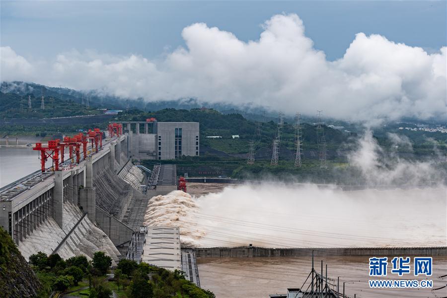 8月20日拍摄的长江三峡水利枢纽工程开启泄洪深孔泄洪的情景。 8月20日8时,“长江2020年第5号洪水”洪峰抵达三峡水利枢纽,入库流量高达75000立方米每秒,这是三峡水利枢纽自2003年建库以来遭遇的最大洪峰。 新华社发(郑家裕 摄)