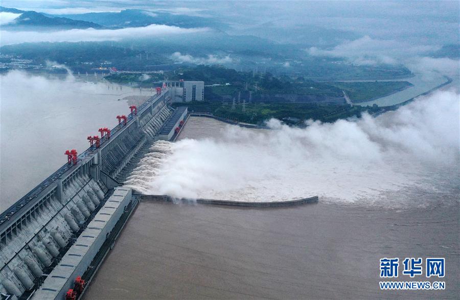 8月20日拍摄的长江三峡水利枢纽工程开启泄洪深孔泄洪的情景(无人机照片)。 8月20日8时,“长江2020年第5号洪水”洪峰抵达三峡水利枢纽,入库流量高达75000立方米每秒,这是三峡水利枢纽自2003年建库以来遭遇的最大洪峰。 新华社发(王辉富 摄)