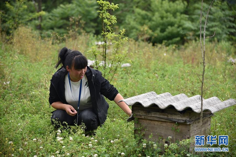 在贵州省毕节市纳雍县锅圈岩苗族彝族乡夹岩村,扶贫队员黄满查看村里的蜜蜂养殖情况(5月23日摄)。 新华社记者 骆飞 摄
