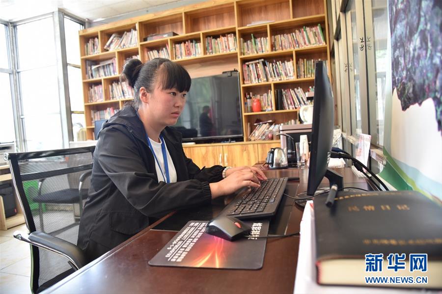 在贵州省毕节市纳雍县锅圈岩苗族彝族乡夹岩村,扶贫队员黄满在查询扶贫资料(5月23日摄)。 新华社记者 骆飞 摄