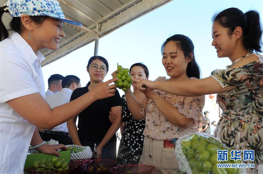 8月21日,游客在阳信县商店镇的特色农产品展上了解不同品种的葡萄。 8月21日,山东省阳信县商店镇举行2020年葡萄王大赛暨乡村旅游采摘活动,吸引游人到商店镇三千亩葡萄种植园采摘、游玩。 新华社发(刘玉和 摄)