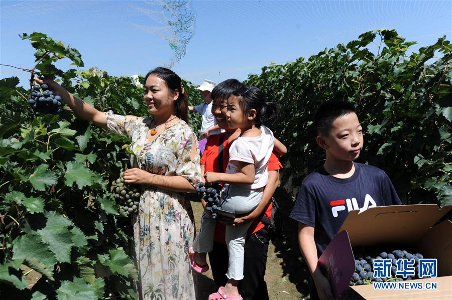 8月21日,游客在阳信县商店镇的葡萄种植园采摘。 8月21日,山东省阳信县商店镇举行2020年葡萄王大赛暨乡村旅游采摘活动,吸引游人到商店镇三千亩葡萄种植园采摘、游玩。 新华社发(刘玉和 摄)