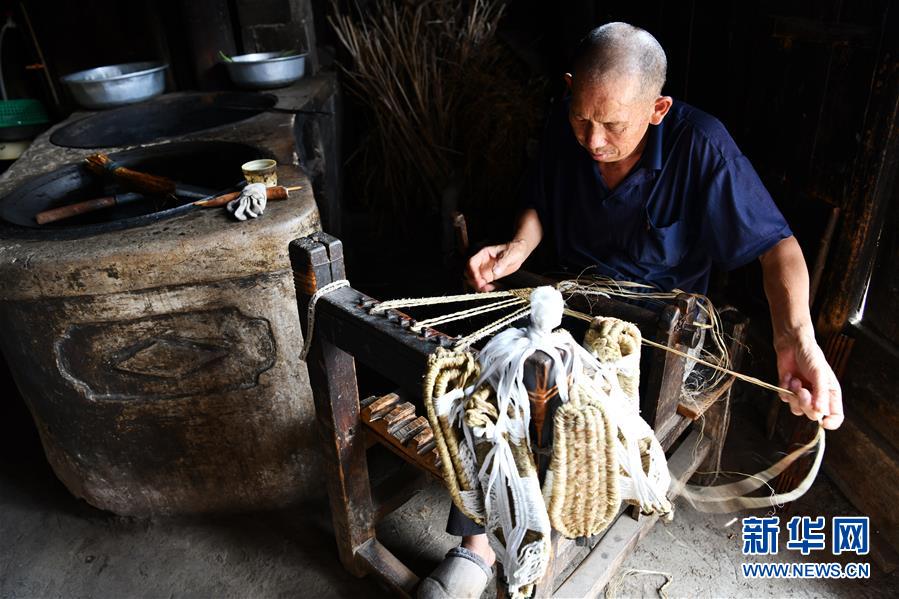 贵州省思南县许家坝镇万塘村村民黄景国在编织草鞋(8月11日摄)。 新华社记者 杨文斌 摄
