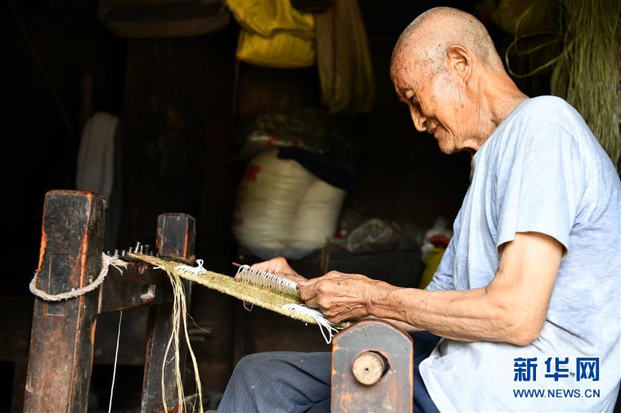贵州省思南县许家坝镇万塘村村民黄景武在编织草鞋(8月11日摄)。新华社记者 杨文斌 摄