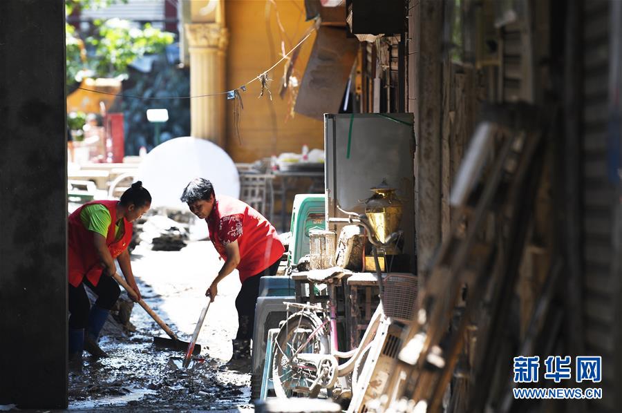 8月23日,党员志愿者在江北区郭家沱街道锣旗寺社区进行清淤作业。 洪峰过去,受灾较为严重的重庆市江北区郭家沱街道在党员干部、社区志愿者、清洁工人等多股力量的齐心协力下,积极开展清淤消杀等灾后恢复重建工作。 新华社记者 王全超 摄