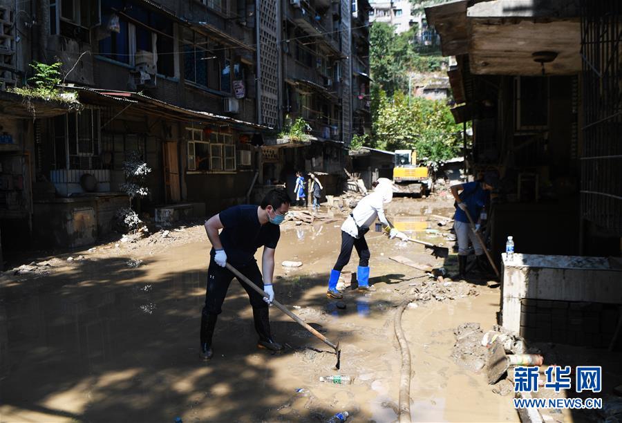 8月23日,志愿者在江北区郭家沱街道锣旗寺社区进行清淤作业。 洪峰过去,受灾较为严重的重庆市江北区郭家沱街道在党员干部、社区志愿者、清洁工人等多股力量的齐心协力下,积极开展清淤消杀等灾后恢复重建工作。 新华社记者 王全超 摄