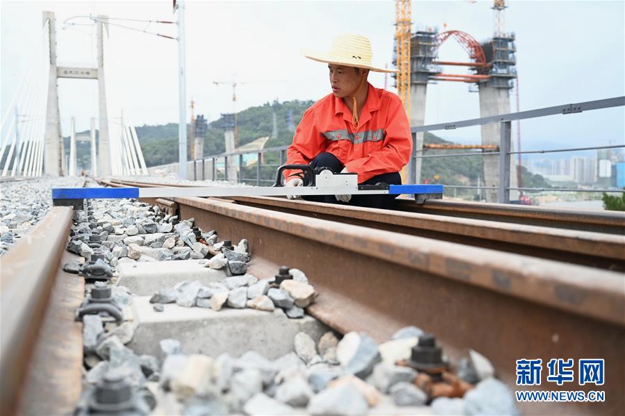 8月24日,中国铁路南昌局集团有限公司福州工务段施工人员在福平铁路乌龙江大桥上测量轨距。 当日,中国铁路南昌局集团有限公司福州工务段等线路改道作业施工人员,在福州至平潭铁路上进行紧张的铁路精调作业。 据介绍,铁路精调是新建铁路联调联试之前的关键工序,主要对钢轨轨距、水平等进行多次精细调整,消灭动静态偏差,从而提升轨道设备平顺度,确保线路开通后列车平稳运行。 新华社记者林善传摄