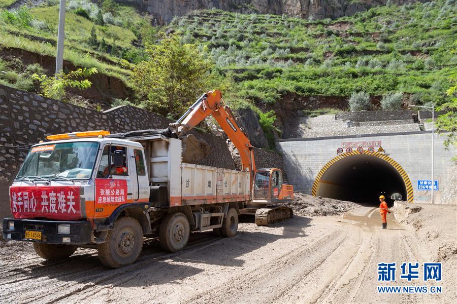 8月24日,救援人员在陇南市武都区通往文县的国道212线宗家坝隧道清理淤泥。新华社发(张啸天 摄)