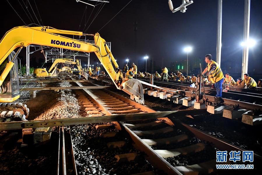 8月25日凌晨,中铁四局施工人员在合安高铁集贤路联络线42号道岔插铺现场施工。 当日凌晨,由中铁四局负责施工的合安高铁集贤路联络线42号道岔插铺完成,为合安高铁9月进入动态验收阶段奠定基础。合安高铁北起合肥,南至安庆,是国家中长期铁路网规划“八纵八横”高速铁路主要通道京港(台)通道的重要组成部分,设计时速350公里。 新华社记者 刘军喜 摄
