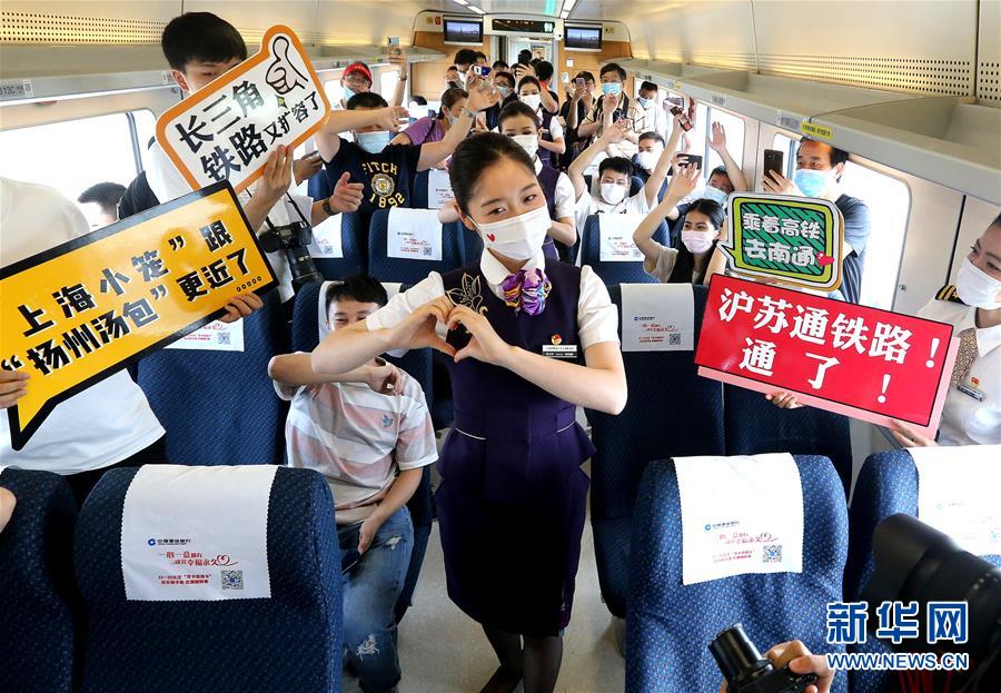 C3836次列车乘务员在车厢内为旅客表演节目(7月1日摄)。7月1日,沪苏通铁路开通运营,上海至南通最快旅行时间压缩至1小时6分钟。新华社记者 陈飞 摄