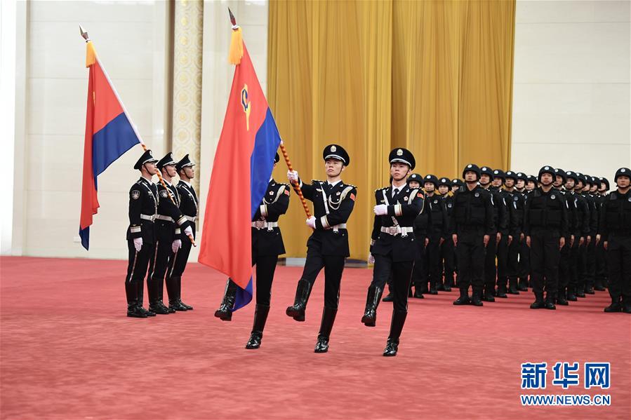 8月26日,在授旗仪式上,仪仗队员护卫着中国人民警察警旗正步行进。 当日,中国人民警察警旗授旗仪式在北京人民大会堂举行。 新华社记者 谢环驰 摄