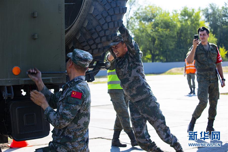 8月25日,在俄罗斯沃罗涅日州1437初级汽车装甲训练中心举行的“汽车能手”项目修理车组比赛中,中国参赛官兵进行轮胎更换作业。 新华社发(王世民 摄)