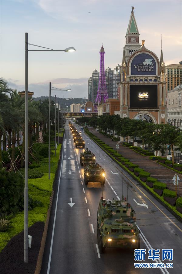 驻澳门部队第20次建制单位轮换期间,轮换部队通过澳门街区(2019年8月29日摄)。 新华社发(方钊 摄)
