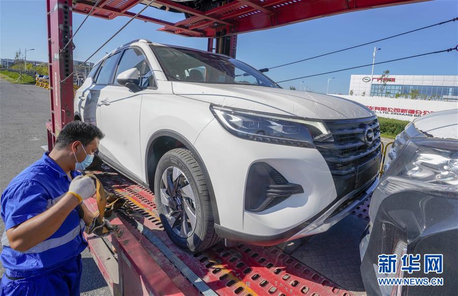 8月31日,在广汽乘用车新疆分公司,广汽传祺轿运车承运商工作人员将出厂的汽车拧上紧固带,准备运往青海等地。新华社记者 赵戈 摄
