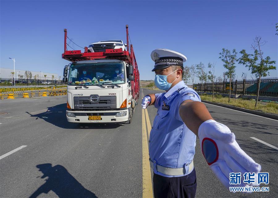 8月31日,乌鲁木齐经济技术开发区(头屯河区)交警大队执勤民警张江涛引导广汽传祺轿运车快速通过。新华社记者 赵戈 摄
