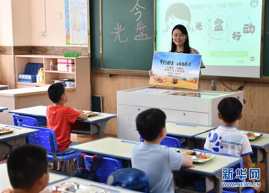 9月1日,合肥市翡翠学校的老师利用午餐前的时间为孩子们上“节约粮食”第一课。 开学伊始,不少学校、幼儿园开展“节约粮食 杜绝浪费”为主题的开学第一课,帮助孩子们认识粮食的重要性,从小树立爱粮、惜粮、节粮的意识。 新华社记者 刘军喜 摄