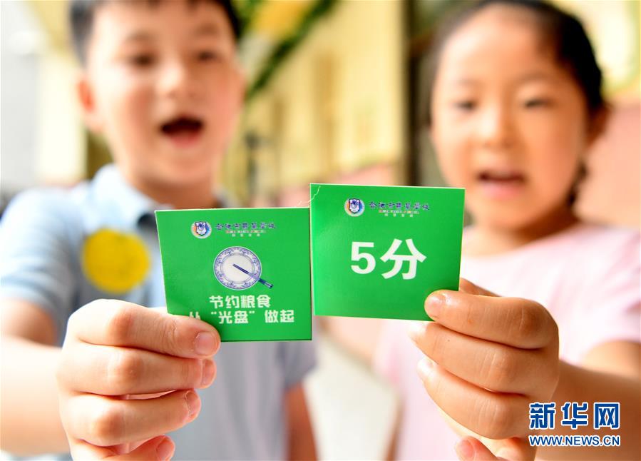 9月1日,合肥市翡翠学校学生在展示“节约粮食”奖励积分卡,积分卡可用来兑换图书。 开学伊始,不少学校、幼儿园开展“节约粮食 杜绝浪费”为主题的开学第一课,帮助孩子们认识粮食的重要性,从小树立爱粮、惜粮、节粮的意识。 新华社记者 刘军喜 摄