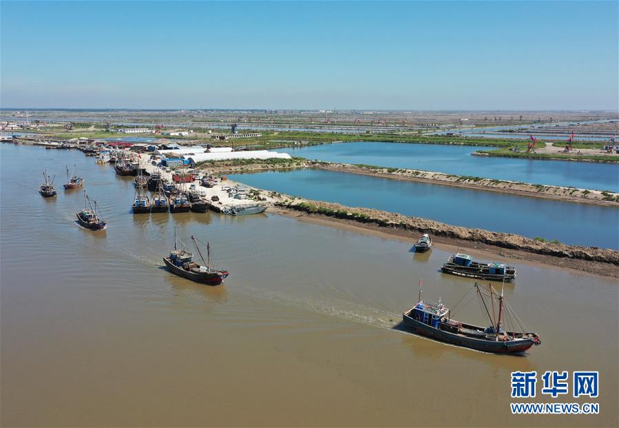 9月1日,河北省唐山市曹妃甸区柳赞镇的渔船开始离港出海捕捞(无人机照片)。 当日,北纬35度以北的渤海和黄海海域结束了为期4个月的伏季休渔期,渔民开始出海捕捞。 新华社记者杨世尧摄