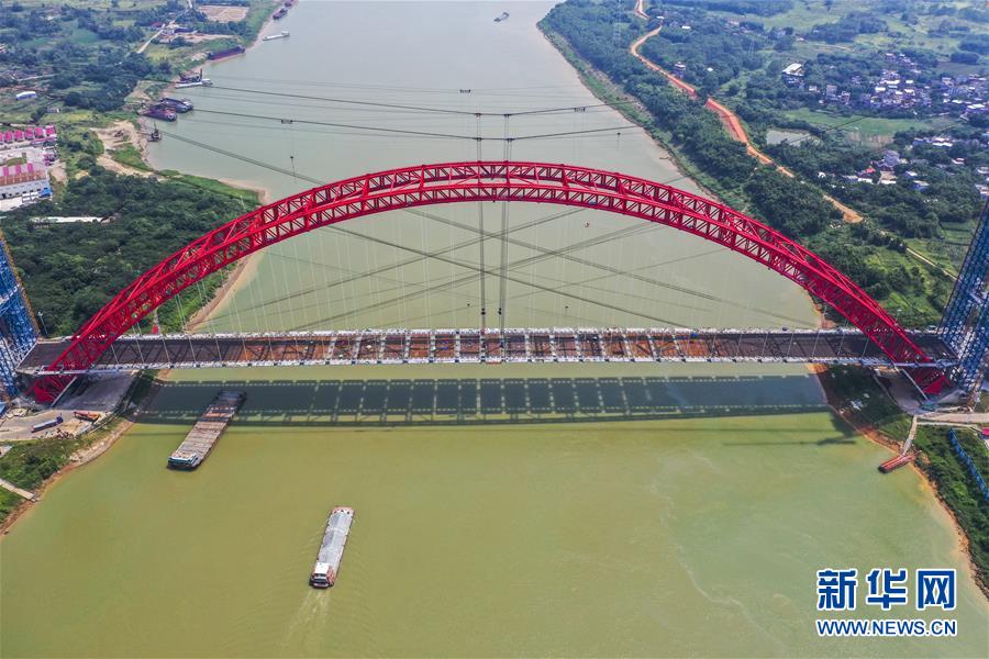 这是9月1日拍摄的广西平南三桥。 当日,广西平南三桥桥面格子梁顺利实现合龙。至此,大桥的主体钢结构全部安装完成,主桥实现贯通。 平南三桥位于广西贵港市平南县,是荔玉高速平南北互通连接线上跨越浔江的一座特大桥。大桥于2018年6月开工建设,全长1035米,主桥跨径575米,预计2020年12月底建成通车。 新华社记者 曹祎铭 摄