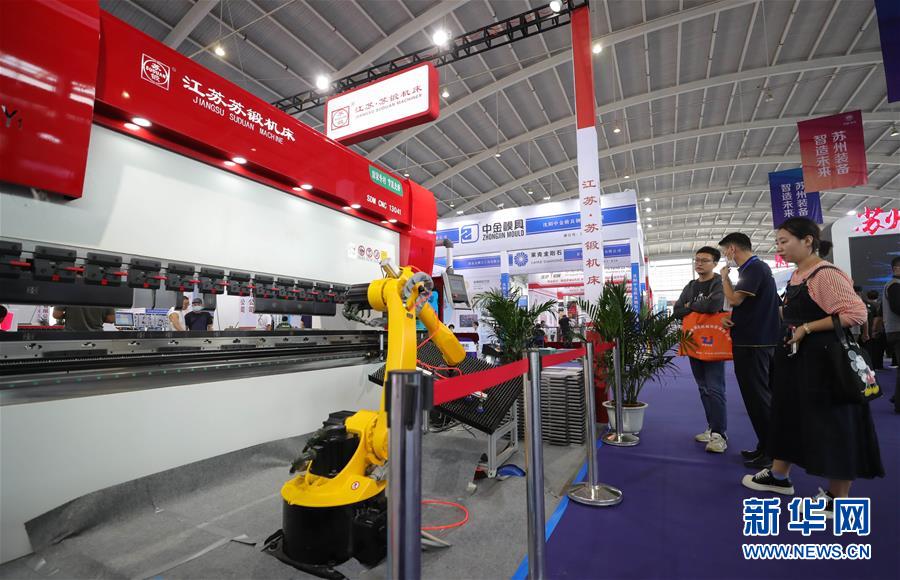 9月1日,参展观众观看江苏苏锻机床展出的伺服数控折弯机。 当日,第十九届中国国际装备制造业博览会在沈阳国际会展中心开幕。本届博览会以“转型升级 合作共赢” 为主题,采取线下线上相结合的方式举办,线下展会将持续到9月5日,线上展会将持续到9月30日。 新华社记者 杨青 摄