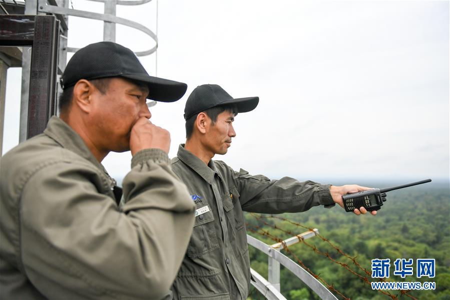 9月2日,巡护员在吉林长白山国家级自然保护区维东自然保护站内的瞭望台上探查。 吉林长白山国家级自然保护区维东自然保护站负责管区面积33720公顷,目前有90人,巡护员们经常在森林里步行,在野外露营地值守,守护着长白山的一草一木。 新华社记者 颜麟蕴 摄