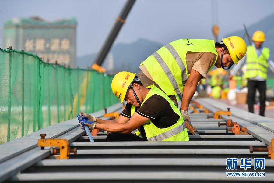 9月2日,中铁十一局施工人员在广东清远磁浮旅游专线铺轨现场进行扣件紧固作业。 当日,中铁十一局施工的广东清远磁浮旅游专线开始铺轨。清远磁浮旅游专线是广东首条中低速磁浮线,项目首期全长8.014公里,预计2020年年底实现主体工程全面完工。 新华社记者刘大伟摄