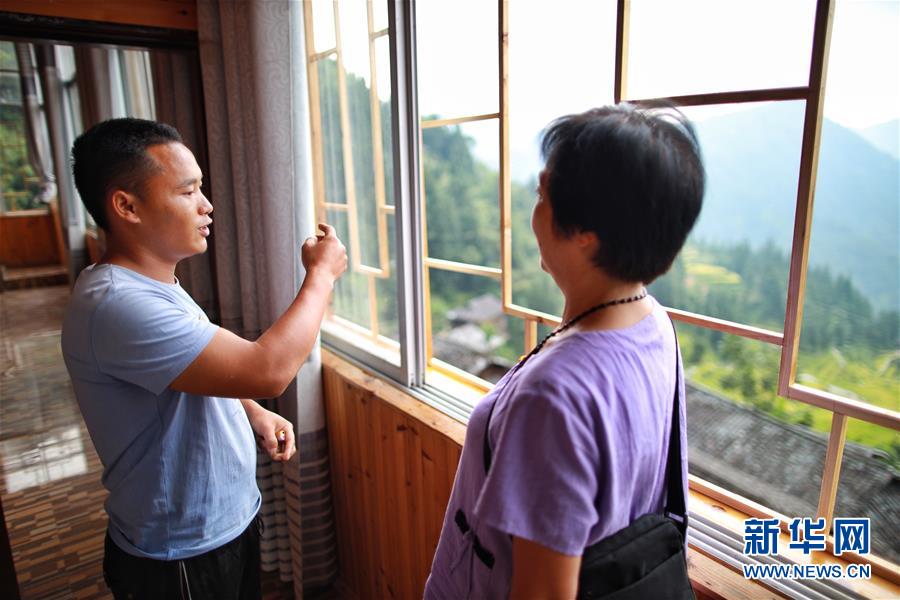 9月3日,加榜乡党扭村村民王世明在自家客栈内为客人介绍。王世明今年24岁,苗族,2016年从浙江温州返乡,利用自家房屋开了一家客栈,目前每年有6万元左右的收入。 贵州省黔东南苗族侗族自治州从江县加榜乡以美丽的梯田景观闻名,但同时也是贫困乡镇。近年来当地大力发展乡村旅游,不少外出打工的人纷纷选择回到家乡从事旅游相关产业,通过勤劳的双手在“家门口”走上致富路。 新华社记者 刘续 摄