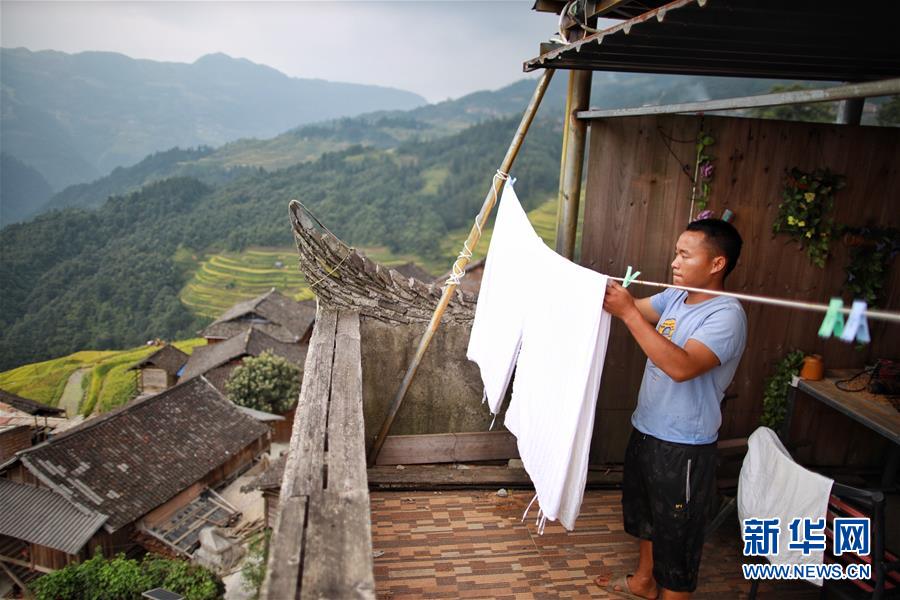9月3日,加榜乡党扭村村民王世明在自家客栈内晾晒床单。王世明今年24岁,苗族,2016年从浙江温州返乡,利用自家房屋开了一家客栈,目前每年有6万元左右的收入。 贵州省黔东南苗族侗族自治州从江县加榜乡以美丽的梯田景观闻名,但同时也是贫困乡镇。近年来当地大力发展乡村旅游,不少外出打工的人纷纷选择回到家乡从事旅游相关产业,通过勤劳的双手在“家门口”走上致富路。 新华社记者 刘续 摄