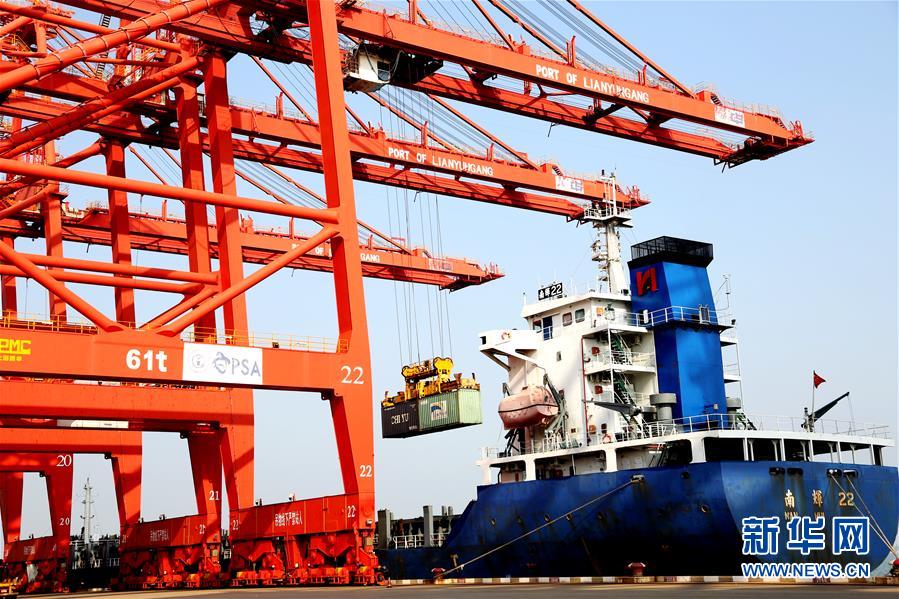 9月7日,一艘远洋运输轮在江苏连云港港集装箱码头装载集装箱出口国外。 当日,海关总署发布数据,今年前8个月,我国货物贸易进出口总值20.05万亿元,同比下降0.6%,降幅持续收窄,接近“转正”。 新华社发(王春 摄)