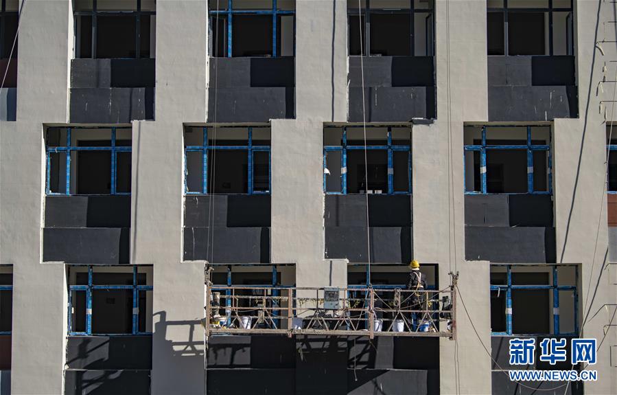 9月8日,中建三局的工人在新疆大学新校区项目工地进行学生宿舍楼外墙面施工作业。 近期,乌鲁木齐市交通、教育、医疗等领域的大型项目抢抓工期,有序推进各项施工作业。 新华社记者 胡虎虎 摄