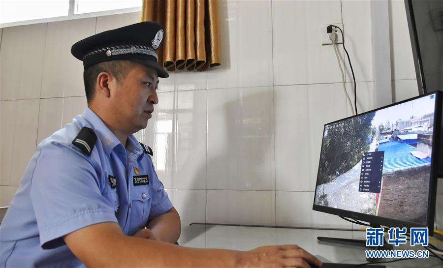 浚县公安局卫溪派出所西长村警务室的辅警张福雨在查看社区监控(9月11日摄)。新华社记者 韩朝阳 摄
