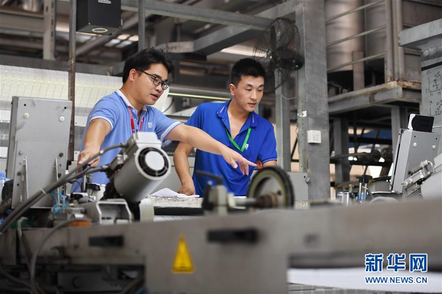 9月8日,来自定西的张刚刚(右)与福建东龙针纺有限公司染整厂生产部技术人员交流。新华社记者 林善传 摄