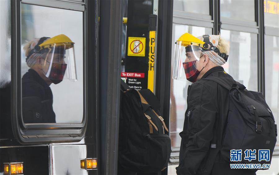 9月17日,在加拿大多伦多,一名戴防护面罩和口罩的乘客登上一辆公交车。 加拿大累计新冠确诊病例升至140539例,累计死亡9199例。 新华社发(邹峥摄)
