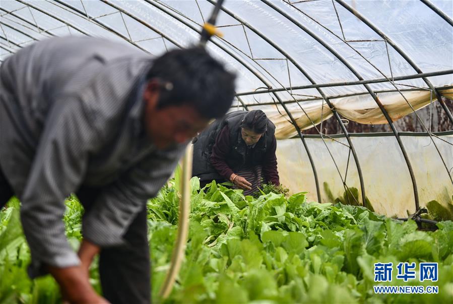 西藏昌都市左贡县亚中村投资修建了18座温室大棚,为村里的建档立卡贫困户提供了36个就业岗位,每人每年可增收5000元以上,大棚蔬菜种植成为助力村民脱贫的新途径。 新华社记者 晋美多吉 摄