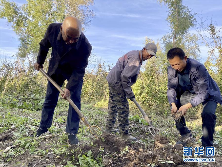 在黑龙江省五常市杜家镇复兴村,云峰四叶参种植农民专业合作社理事长侯伟(右一)和村民在种植四叶参的小院内劳作(9月27日摄)。 新华社记者 刘赫垚 摄