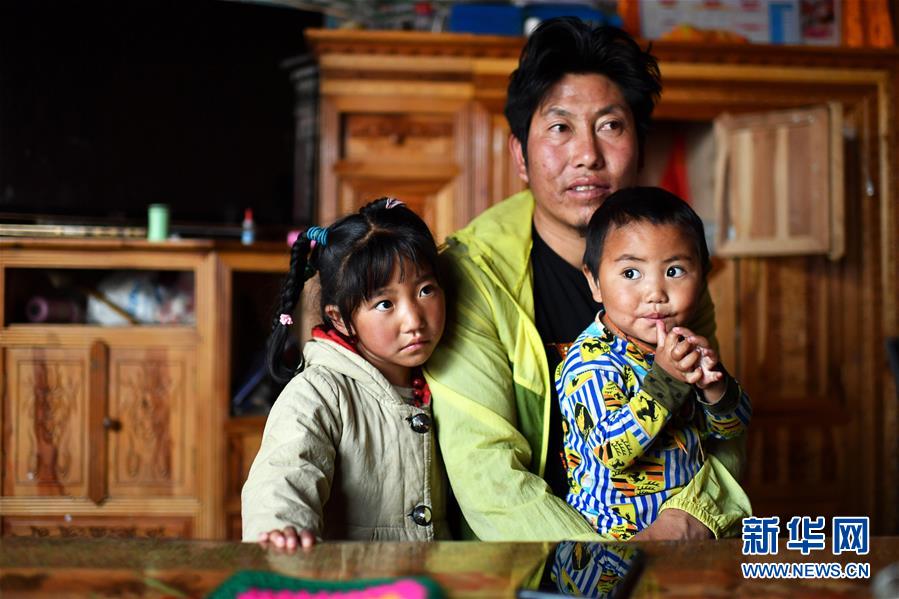 在西藏昌都市丁青县尺牍镇易地扶贫搬迁安置点,30岁的村民热旦和孩子们在屋里休息(9月18日摄)。 新华社记者 詹彦 摄
