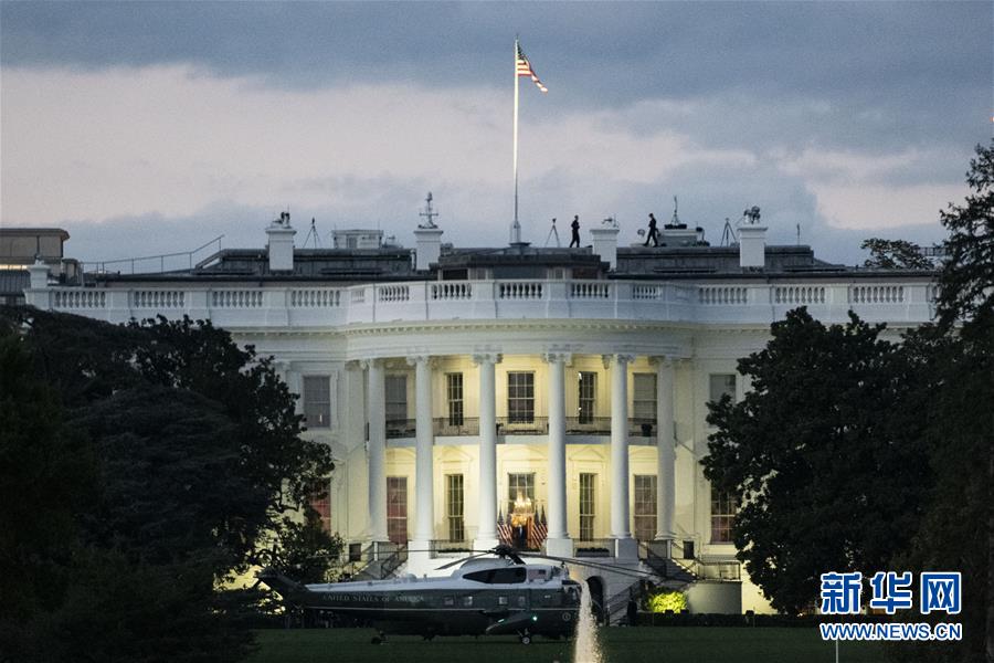 10月5日,在美国华盛顿,美国总统特朗普乘坐直升机抵达白宫。 正在接受新冠治疗的美国总统特朗普于美国东部时间5日傍晚出院返回白宫,但其医疗团队说,特朗普还未痊愈。 新华社记者 刘杰 摄
