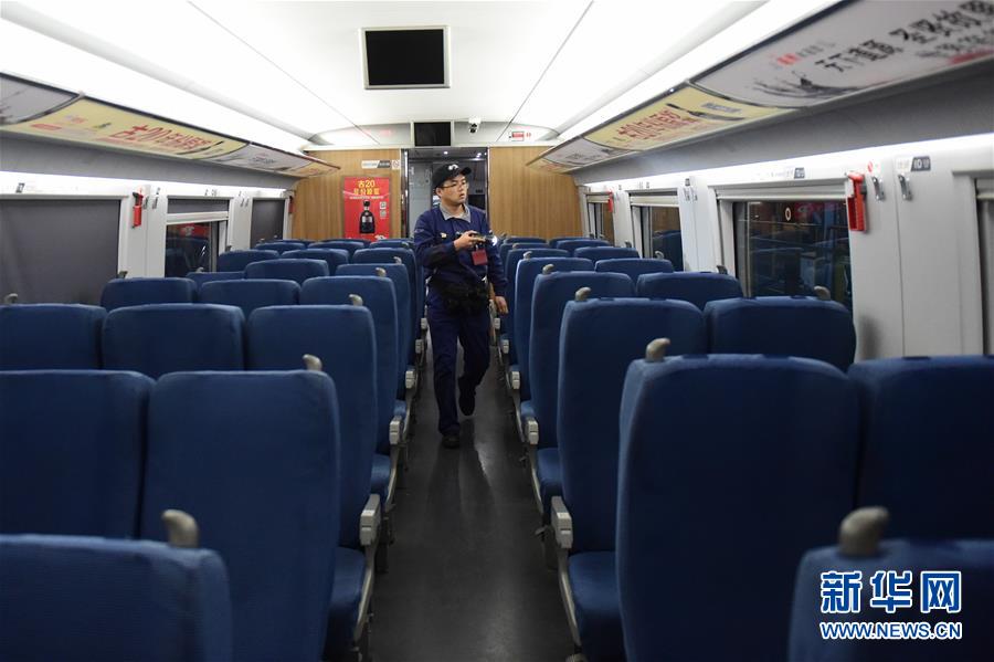 10月6日晚,合肥南动车运用所的工作人员对动车组内部进行检查。 国庆和中秋长假期间,合肥南动车运用所的工作人员坚守岗位,对动车组进行全面细致检修,确保列车运行安全。 新华社记者 黄博涵 摄