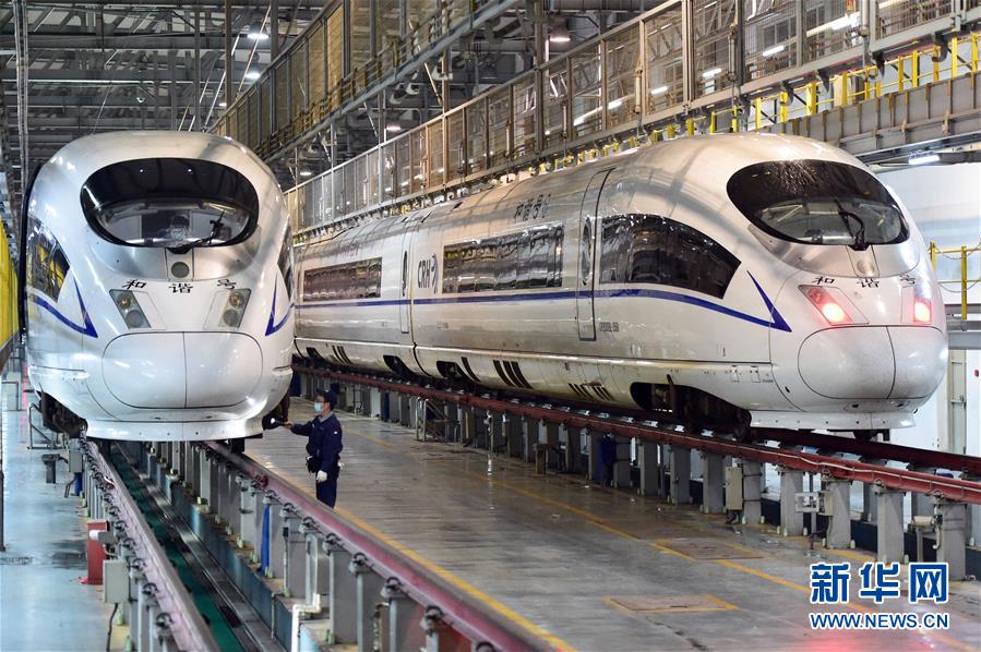 10月6日晚,合肥南动车运用所的工作人员对动车组进行检修。 国庆和中秋长假期间,合肥南动车运用所的工作人员坚守岗位,对动车组进行全面细致检修,确保列车运行安全。 新华社记者 黄博涵 摄