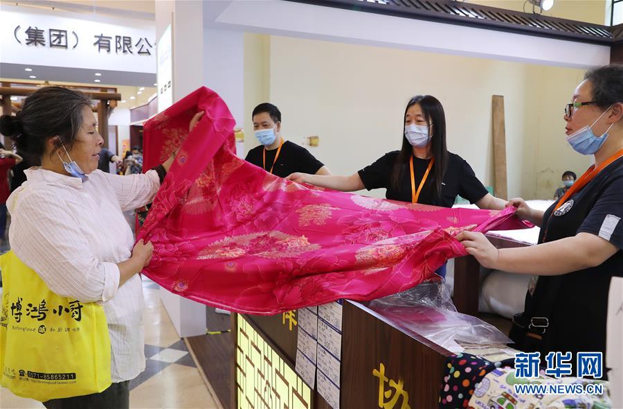 10月10日,一名参观者在一老字号展位前挑选布料。 当日,2020中华老字号博览会在上海展览中心开幕。博览会汇聚全国220多家知名老字号品牌,吸引安徽、山东、广东、福建、江西等多地组团参展,展品范围涉及食品餐饮、轻工百货、服装鞋帽、珠宝首饰、家居用品、医药保健、品牌服务多个品类。众多老字号品牌呈现IP化、数字化和年轻化趋势,引领新国潮风尚。 新华社记者 方喆 摄