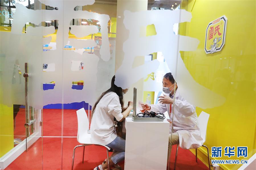 10月10日,一名医师在上海雷允上药业有限公司展台为参观者现场看诊。 当日,2020中华老字号博览会在上海展览中心开幕。博览会汇聚全国220多家知名老字号品牌,吸引安徽、山东、广东、福建、江西等多地组团参展,展品范围涉及食品餐饮、轻工百货、服装鞋帽、珠宝首饰、家居用品、医药保健、品牌服务多个品类。众多老字号品牌呈现IP化、数字化和年轻化趋势,引领新国潮风尚。 新华社记者 方喆 摄