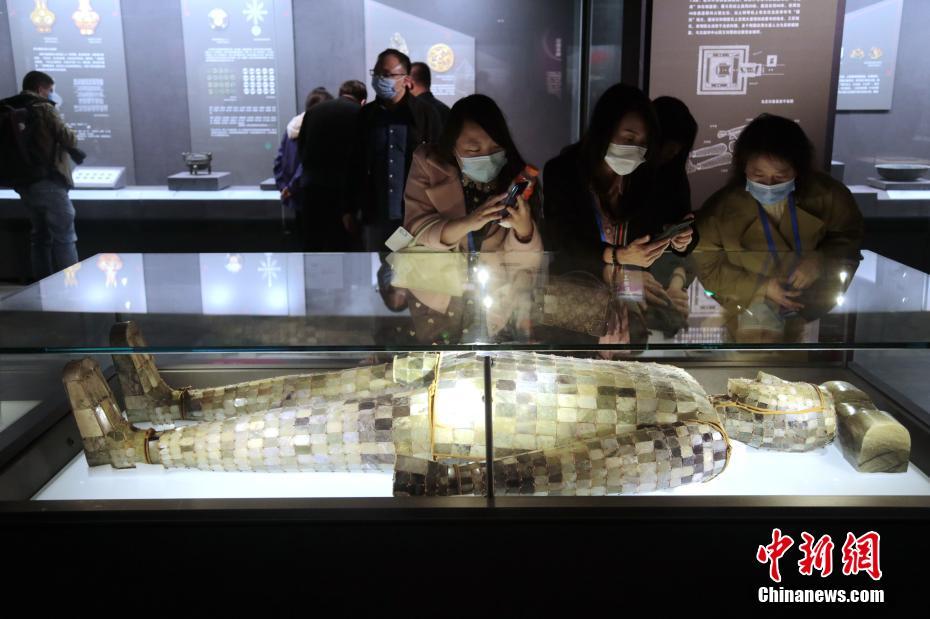 10月10日,观众在参观鎏金铜缕玉衣。当日,“父子家国—汉代中山王陵及王室墓出土文物特展”在西安汉景帝阳陵博物院开幕,由汉景帝阳陵博物院、河北博物院联合举办。本次特展是以汉景帝刘启、中山靖王刘胜父与子、帝与王的血缘家国纽带为线索进行的一次展览实践,参展文物共计90件(组),以中山靖王刘胜夫妇、中山怀王刘修、中山简王刘焉等王族陵墓精品文物为主。中新社记者 张远 摄