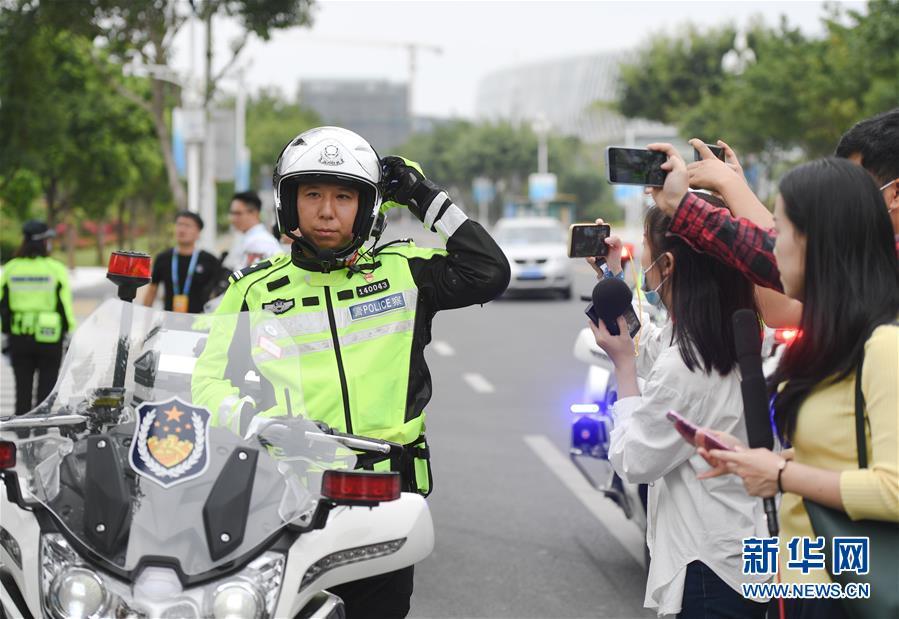 10月12日,在福建福州海峡国际会展中心附近,福州交警铁骑队员接受媒体采访。新华社记者 宋为伟 摄