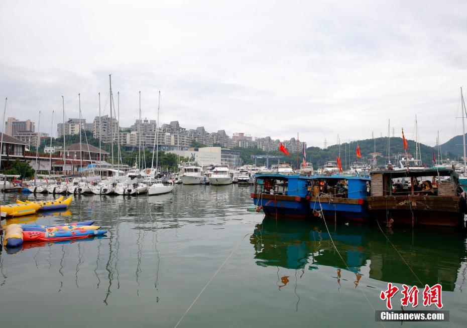 截至当日11时,三亚市区阴云密布但尚未降雨。据气象部门监测,“浪卡”(热带风暴级)13日上午9时中心位于距离海南省万宁市偏东方向约205公里的南海北部海面上,中心附近最大风力为9级(23米/秒)。图为三亚港内,游艇、橡皮艇和渔船锚泊在一起。王晓斌 摄