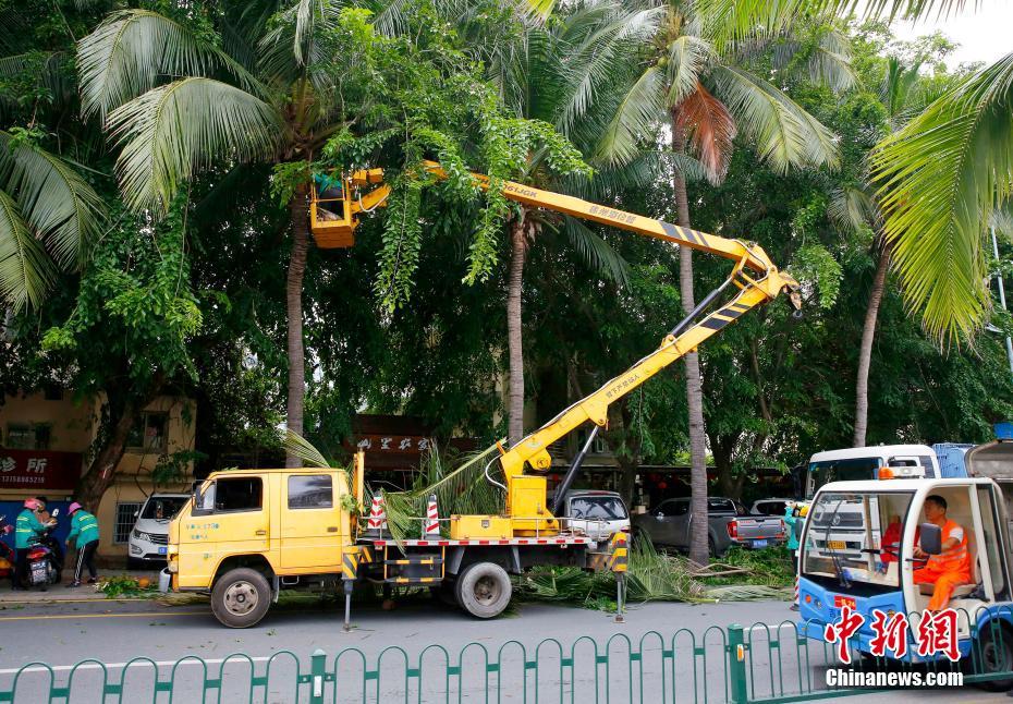 三亚市吉阳区,台风来临前园林环卫工人在修剪椰树树枝。王晓斌 摄