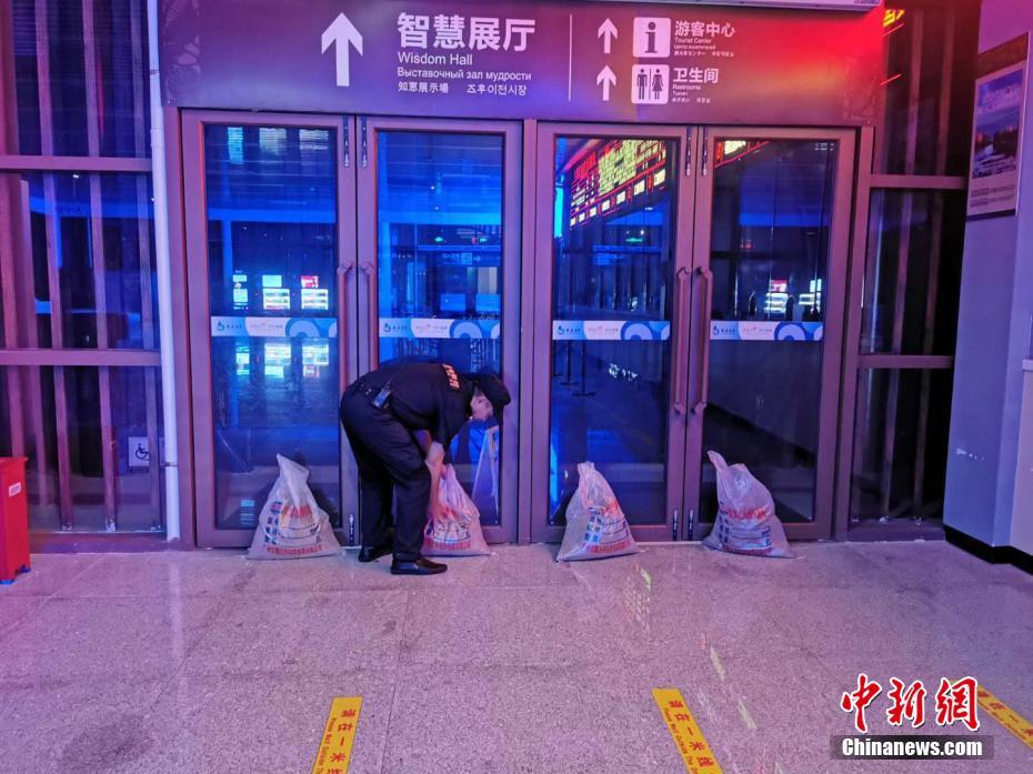 三亚天涯海角景区,工作人员在门口放置沙袋。13日全市景区景点暂停营业。 赵桂媛供图