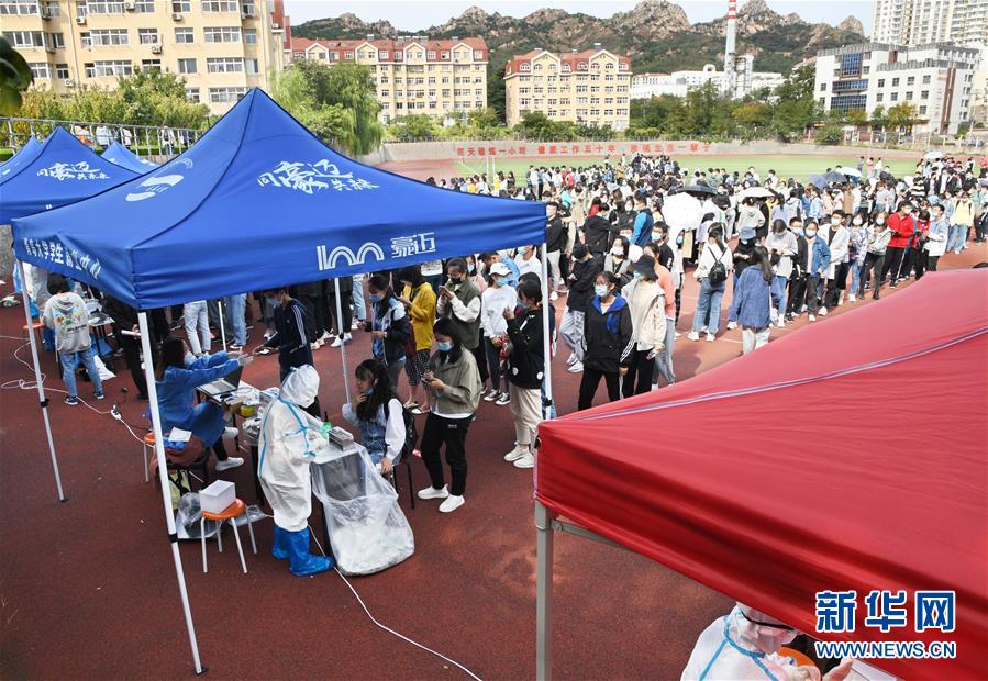 10月13日,学生在青岛大学体育场检测点进行核酸检测采样。 记者13日从青岛市政府新闻办召开的新闻发布会上获悉,青岛市目前共有万余名医务人员进行全员核酸检测工作,截至13日15时30分,青岛市已采样4235438份,已出结果1945252份,除已公布的6例确诊病例和6例无症状感染者外,未发现新增阳性感染者。 新华社记者 李紫恒 摄