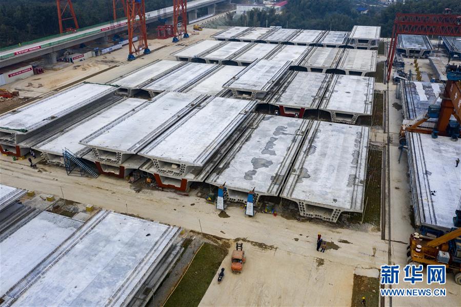 10月13日拍摄的中铁十一局常益长铁路望城西梁场(无人机照片)。 目前,常(德)益(阳)长(沙)铁路进入架梁高峰,承担制梁任务的中铁十一局桥梁公司的建设者们昼夜加班赶制,确保铁路桥梁如期架设。 常益长铁路全长157公里,设计时速350公里,是国家“八纵八横”高速铁路网的重要组成部分。 新华社发(王荃荃 摄)