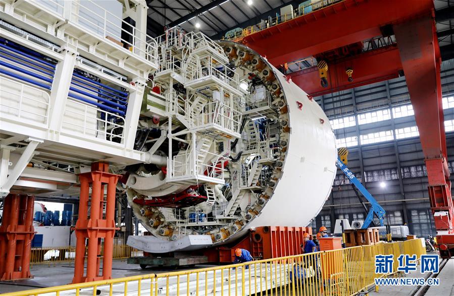 10月15日,在隧道股份上海隧道工程有限公司机械制造分公司生产车间,工人在对“骐跃”盾构机进行安装调试。 近日,由隧道股份上海隧道工程有限公司自主研发制造的超大直径盾构机“骐跃”在上海浦东成功调试下线。“骐跃”整机总重约为3200吨,总长约为99米,其中主机长度约为16米,刀盘切削直径达14.05米。 新华社记者 方喆 摄