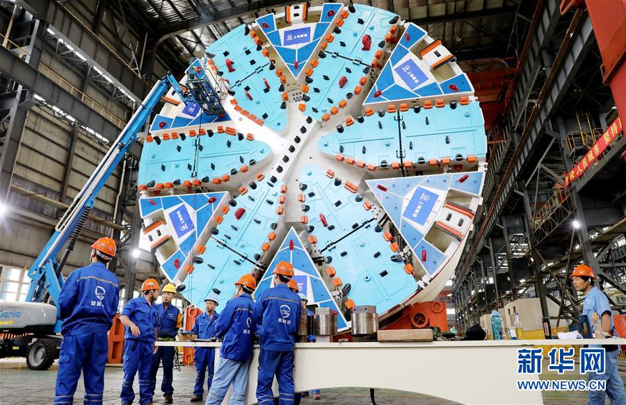 10月15日,在隧道股份上海隧道工程有限公司机械制造分公司生产车间,工人在“骐跃”盾构机旁讨论交流。 近日,由隧道股份上海隧道工程有限公司自主研发制造的超大直径盾构机“骐跃”在上海浦东成功调试下线。“骐跃”整机总重约为3200吨,总长约为99米,其中主机长度约为16米,刀盘切削直径达14.05米。 新华社记者 方喆 摄